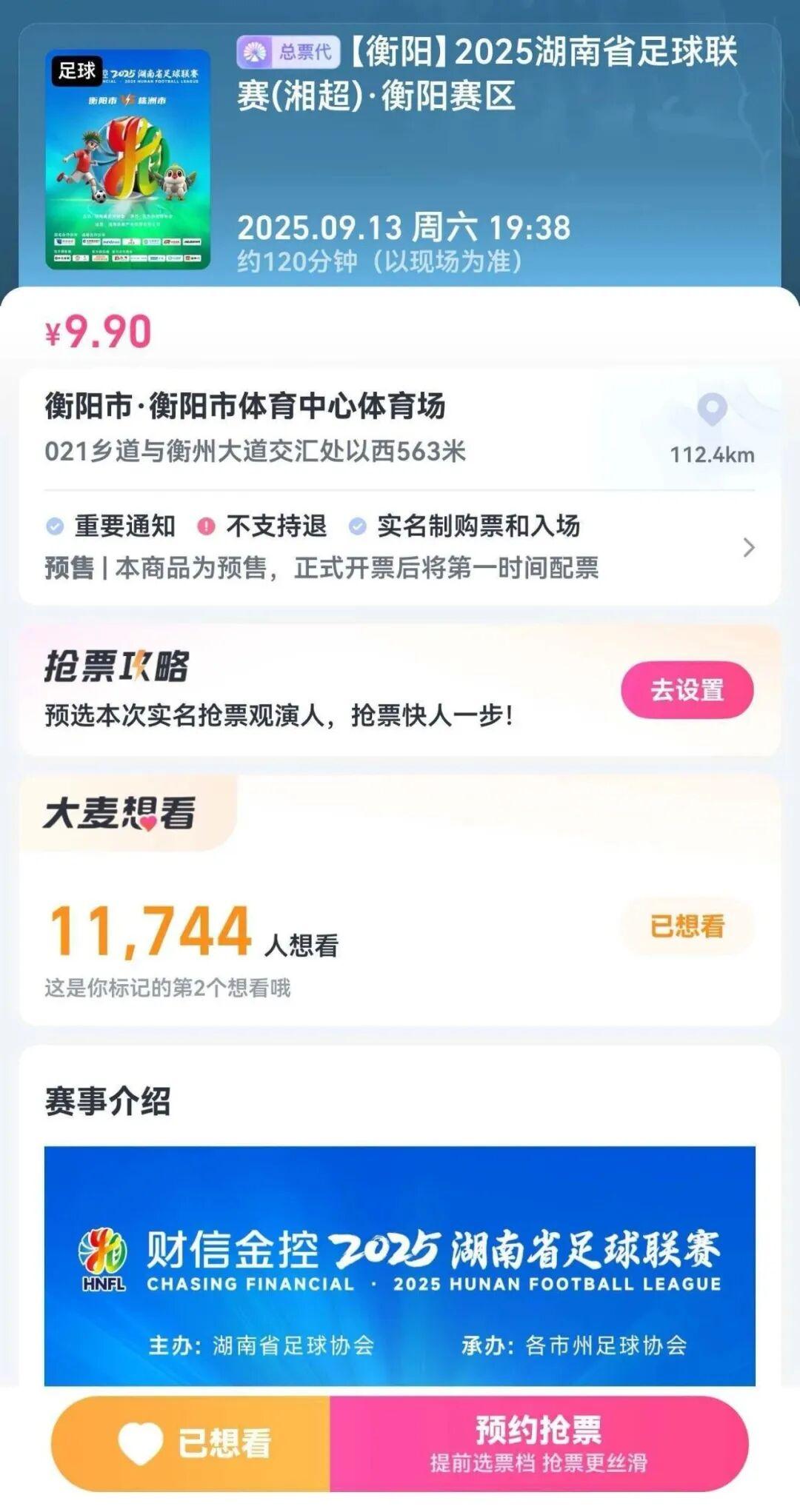 来了!来了!9月10日12:08分“湘超”首轮衡阳队VS株洲队的门票要开抢啦!9月13日(本周六)19:38分,“湘超”首轮,株洲队将客场挑战衡阳队,精彩值得期待。本场比赛门票统一票价为9.9元/张,球迷朋友可在大麦网预约抢票。(点击下图抢票)0733 BASE 株洲球迷会欢迎你的加入编辑丨龙艳军 唐思捷审核 丨彭建南 刘婷 李衡洲校对 | 符政军...